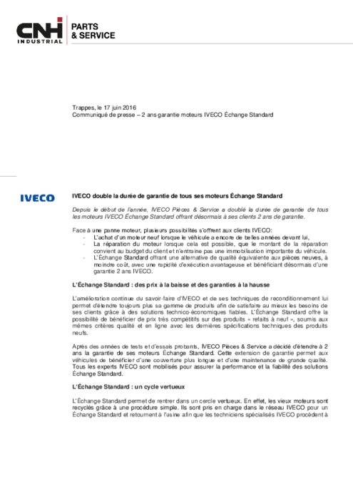 Depuis le début de l’année, IVECO Pièces & Service a doublé la durée de garantie de tous les moteurs IVECO Échange Standard offrant désormais à ses clients 2 ans de garantie.