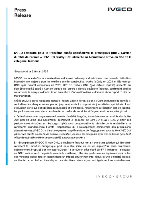 IVECO continue d'affirmer son rôle dans le domaine du transport durable avec une nouvelle distinction internationale majeure pour la troisième année consécutive. Après l'eDaily en 2024 et l'Eurocargo GNC (gaz naturel comprimé) en 2025, l'IVECO S-Way GNL (gaz naturel liquéfié) alimenté au biométhane a été sacré « Camion durable de l'année » dans la catégorie Tracteur, confirmant ainsi la capacité de la marque à donner le ton en matière d'innovation dans le domaine du transport routier de marchandises.