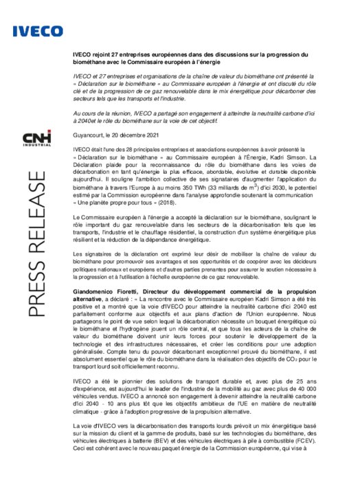 Iveco et 27 entreprises et organisations de la chaîne de valeur du biométhane ont présenté la «Déclaration sur le biométhane» au Commissaire européen à l'énergie et ont discuté du rôle clé et de la progression de ce gaz renouvelable dans le mix énergétique pour décarboner des secteurs tels que les transports et l'industrie.