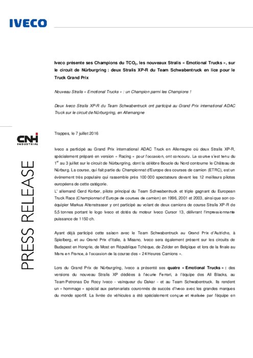 Iveco a participé au Grand Prix international ADAC Truck en Allemagne où deux Stralis XP-R, spécialement préparé en version " Racing " pour l’occasion, ont concouru. La course s’est tenu du 1er au 3 juillet sur le circuit de Nürburgring, dont la célèbre Boucle du Nord contourne le Château de Nürburg. La course, qui fait partie du Championnat d'Europe des courses de camion (ETRC), est un événement très populaire qui rassemble près 100 000 spectateurs devant les 12 meilleurs pilotes européens.