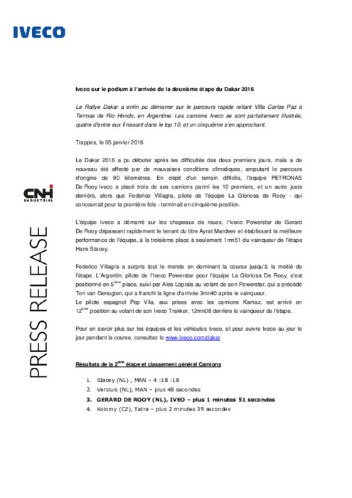 Constructeurs 05 janvier 2016 - 16:03 Le Rallye Dakar a enfin pu démarrer sur le parcours rapide reliant Villa Carlos Paz à Termas de Rio Hondo, en Argentine. Les camions Iveco se sont parfaitement illustrés, quatre d’entre eux finissant dans le top 10, et un cinquième s’en approchant. PDF (216 Ko) Télécharger