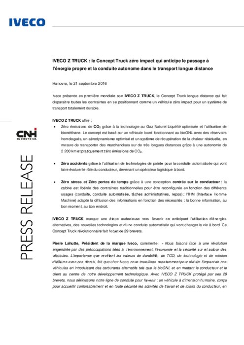 Iveco présente en première mondiale son IVECO Z TRUCK, le Concept Truck longue distance qui fait disparaître toutes les contraintes en se positionnant comme un véhicule zéro impact pour un système de transport totalement durable. IVECO Z TRUCK marque une étape audacieuse vers l’avenir en anticipant l’utilisation d’énergies alternatives, des nouvelles technologies et d’une conduite automatisée qui vont changer la vie à bord. Ce Concept Truck révolutionnaire fait l’objet de 29 brevets.