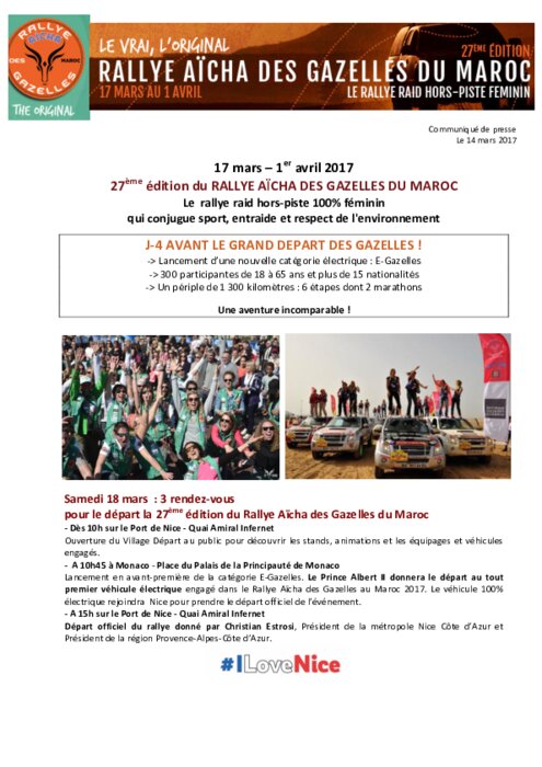 Des Gazelles qui ont tous les talents... Ce sont plus de 300 femmes de 18 à 65 ans de plus de 15 nationalités et d'horizons différents qui vont s'élancer cette année en duo dans le désert marocain. Toutes partagent le même objectif : relever le défi que représente le Rallye Aïcha des Gazelles. Aux volants de leur 4x4, Crossover, les participantes vont vivre une incroyable aventure féminine et sportive basée sur la conduite hors piste et la navigation à la boussole...