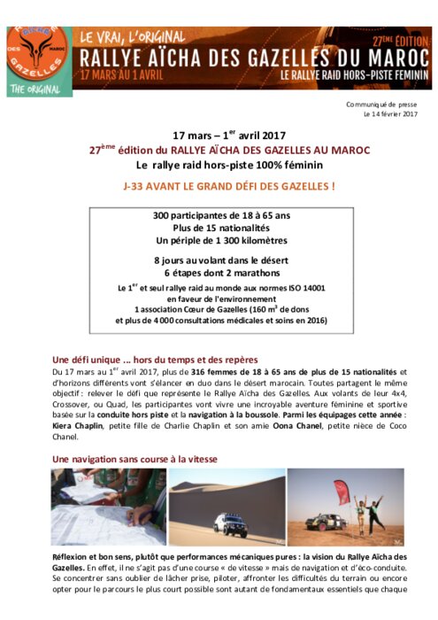 Du 17 mars au 1er avril 2017, plus de 316 femmes de 18 à 65 ans de plus de 15 nationalités et d'horizons différents vont s'élancer en duo dans le désert marocain. Toutes partagent le même objectif : relever le défi que représente le Rallye Aïcha des Gazelles. Aux volants de leur 4x4, Crossover, ou Quad, les participantes vont vivre une incroyable aventure féminine et sportive basée sur la conduite hors piste et la navigation à la boussole...