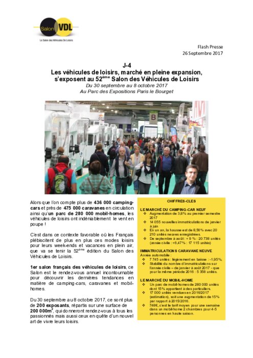 Alors que l’on compte plus de 436 000 camping-cars et près de 475 000 caravanes en circulation ainsi qu’un parc de 280 000 mobil-homes, les véhicules de loisirs ont indéniablement le vent en poupe ! C’est dans ce contexte favorable où les Français plébiscitent de plus en plus ces modes loisirs pour leurs week-ends et vacances en plein air, que va se tenir la 52eme édition du Salon des Véhicules de Loisirs.