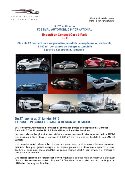 Le 31e Festival Automobile International, ouvrira les portes de l’exposition « Concept Cars » du 27 au 31 janvier 2016 à Paris - Hôtel national des Invalides.