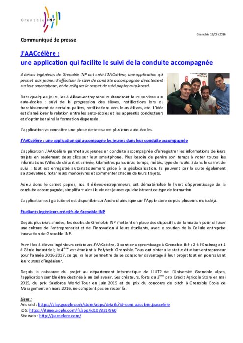 4 élèves-ingénieurs de Grenoble INP ont créé J'AACcélère, une application qui permet aux jeunes d’effectuer le suivi de conduite accompagnée directement sur leur smartphone, et de reléguer le carnet de suivi papier au placard. Dans quelques jours, les 4 élèves-entrepreneurs étendront leurs services aux auto-écoles : suivi de la progression des élèves, notifications lors du franchissement de certains paliers... L’application va connaître une phase de tests avec plusieurs auto-écoles.