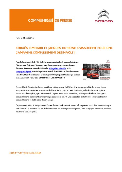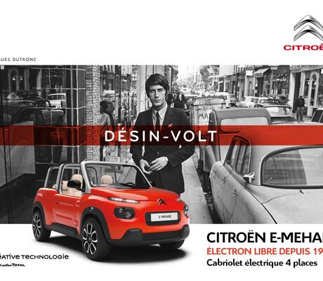 Pour le lancement de E-MEHARI, le nouveau cabriolet 4 places électrique, Citroën n'en finit pas d'étonner, avec des communications résolument décalées. Entre une prise de la Bastille (#PlageDeLaBastille) et la campagne digitale menée depuis son reveal, E-MEHARI se dévoile comme l'électron libre de la gamme. C'est aujourd'hui Jacques Dutronc qui incarne en un clin d'œil l'esprit de E-MEHARI : " DÉSIN-VOLT " !