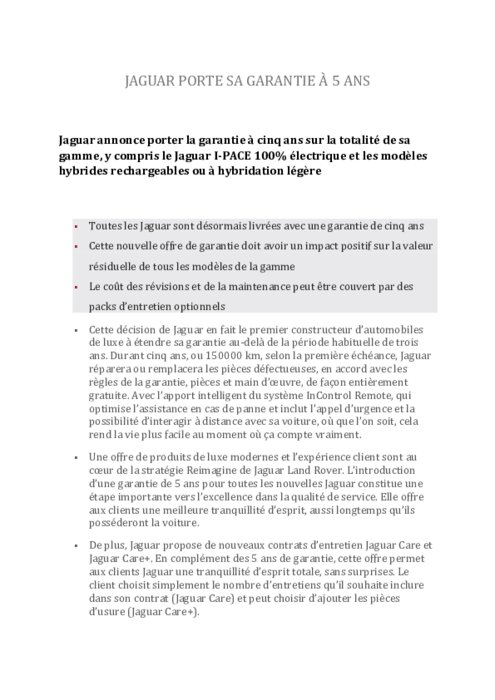 Constructeurs 04 juillet 2022 - 15:45 Jaguar annonce porter la garantie à cinq ans sur la totalité de sa gamme, y compris le Jaguar I-PACE 100% électrique et les modèles hybrides rechargeables ou à hybridation légère. PDF (131 Ko) Télécharger
