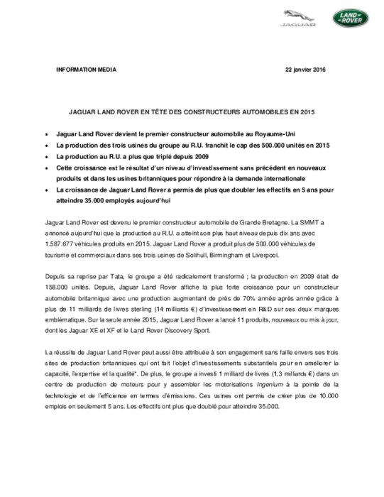 Constructeurs 22 janvier 2016 - 16:09 Jaguar Land Rover devient le premier constructeur automobile au Royaume-Uni. La production des trois usines du groupe au R.U. franchit le cap des 500.000 unités en 2015. La production au R.U. a plus que triplé depuis 2009. PDF (183 Ko) Télécharger