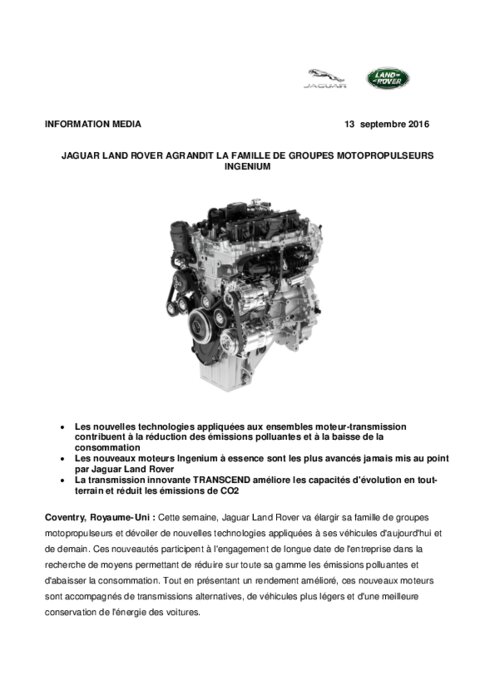Jaguar Land Rover va élargir sa famille de groupes motopropulseurs et dévoiler de nouvelles technologies appliquées à ses véhicules d'aujourd'hui et de demain. Ces nouveautés participent à l'engagement de longue date de l'entreprise dans la recherche de moyens permettant de réduire sur toute sa gamme les émissions polluantes et d'abaisser la consommation.