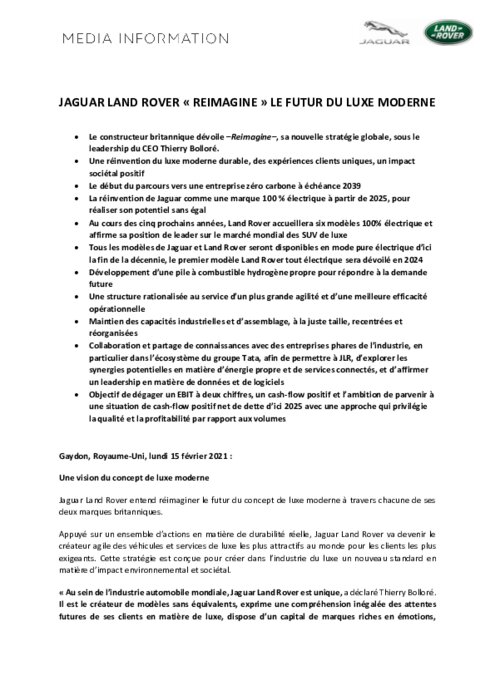 Jaguar Land Rover entend réimaginer le futur du concept de luxe moderne à travers chacune de ses deux marques britanniques. Appuyé sur un ensemble d'actions en matière de durabilité réelle, Jaguar Land Rover va devenir le créateur agile des véhicules et services de luxe les plus attractifs au monde pour les clients les plus exigeants. Cette stratégie est conçue pour créer dans l'industrie du luxe un nouveau standard en matière d'impact environnemental et sociétal.