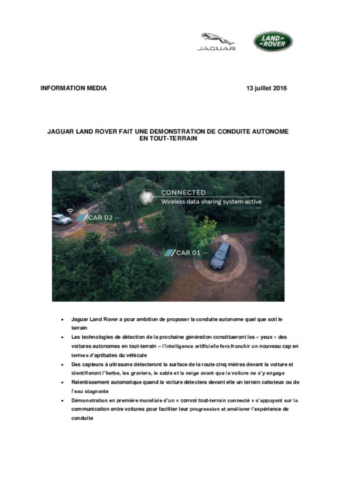Jaguar Land Rover a fait une démonstration des nouvelles technologies qui permettront à l’avenir à une voiture autonome de se conduire elle-même en toutes circonstances. Les recherches menées par Jaguar Land Rover sur la conduite autonome en tout-terrain ont pour but de permettre à une voiture autonome d’évoluer quels que soient le terrain et les conditions météorologiques.