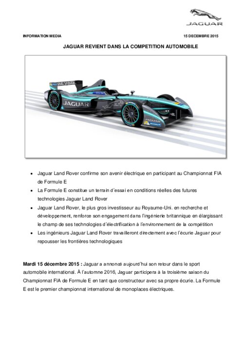Jaguar a annoncé son retour dans le sport automobile international. À l’automne 2016, Jaguar participera à la troisième saison du Championnat FIA de Formule E en tant que constructeur avec sa propre écurie. La Formule E est le premier championnat international de monoplaces électriques.