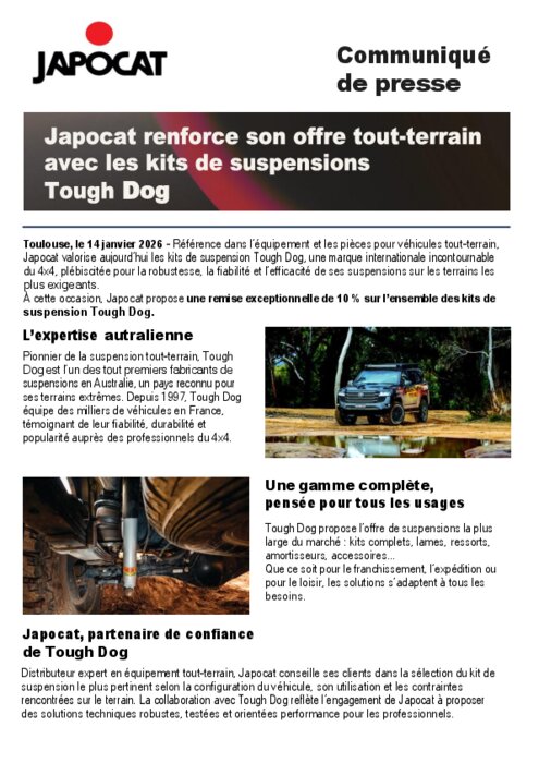 Référence dans l’équipement et les pièces pour véhicules tout-terrain, Japocat valorise aujourd’hui les kits de suspension Tough Dog, une marque internationale incontournable du 4x4, plébiscitée pour la robustesse, la fiabilité et l’efficacité de ses suspensions sur les terrains les plus exigeants.