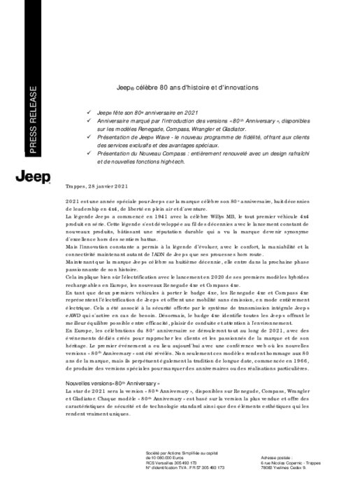 2021 est une année spéciale pour Jeep car la marque célèbre son 80e anniversaire, huit décennies de leadership en 4x4, de liberté en plein air et d'aventure. La légende Jeep a commencé en 1941 avec la célèbre Willys MB, le tout premier véhicule 4x4 produit en série. Cette légende s'est développée au fil des décennies avec le lancement constant de nouveaux produits, bâtissant une réputation durable qui a vu la marque devenir synonyme d'excellence hors des sentiers battus...