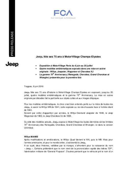 Jeep fête ses 75 ans d'histoire à MotorVillage Champs-Elysées en exposant, jusqu’au 20 juillet, quatre modèles emblématiques et la gamme 75th Anniversary. La mise en scène originale par décades fait la part belle aux objets cultes et aux images d’époque.