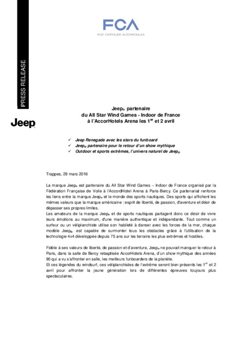 La marque Jeep est partenaire du All Star Wind Games Indoor de France organisé par la Fédération Française de Voile à l’AccordHotel Arena à Paris-Bercy. Ce partenariat renforce les liens entre la marque Jeep et le monde des sports nautiques. Des sports qui affichent les mêmes valeurs que la marque américaine : esprit de liberté, de passion, d'aventure et désir de dépasser ses propres limites. Les amateurs de la marque Jeep et de sports nautiques partagent donc ce désir de vivre leurs émotions.