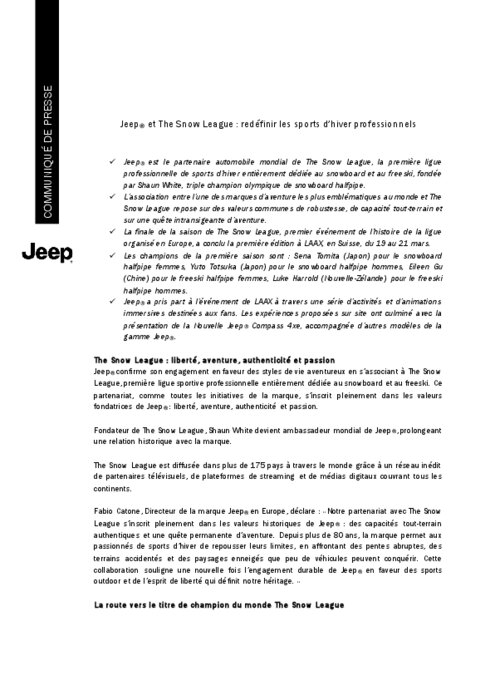 Jeep confirme son engagement en faveur des styles de vie aventureux en s’associant à The Snow League, première ligue sportive professionnelle entièrement dédiée au snowboard et au freeski. Ce partenariat, comme toutes les initiatives de la marque, s’inscrit pleinement dans les valeurs fondatrices de Jeep® : liberté, aventure, authenticité et passion.