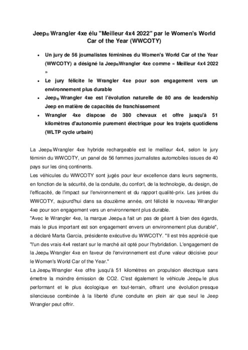 La Jeep Wrangler 4xe hybride rechargeable est le meilleur 4x4, selon le jury féminin du WWCOTY, un panel de 56 femmes journalistes automobiles issues de 40 pays sur les cinq continents. Les véhicules du WWCOTY sont jugés pour leur excellence dans leurs segments, en fonction de la sécurité, de la conduite, du confort, de la technologie, du design, de l'efficacité, de l'impact sur l'environnement et du rapport qualité-prix...