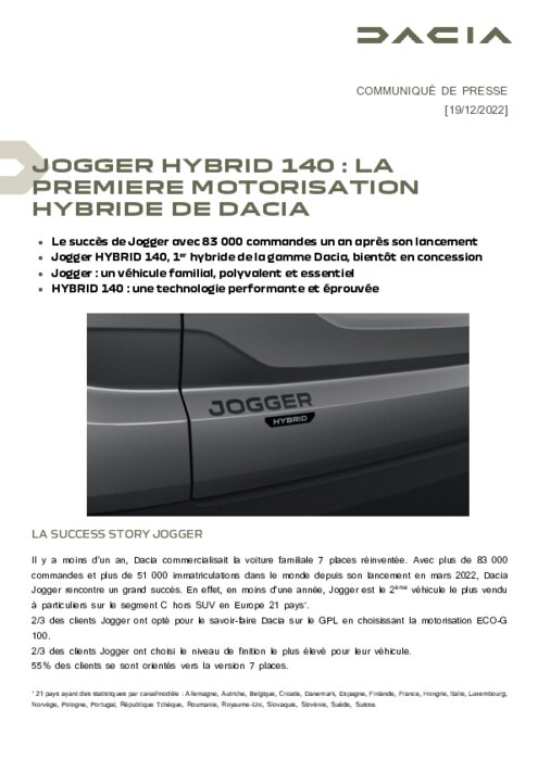 Il y a moins d’un an, Dacia commercialisait la voiture familiale 7 places réinventée. Avec plus de 83 000 commandes et plus de 51 000 immatriculations dans le monde depuis son lancement en mars 2022, Dacia Jogger rencontre un grand succès. En effet, en moins d’une année, Jogger est le 2ème véhicule le plus vendu à particuliers sur le segment C hors SUV en Europe 21 pays.