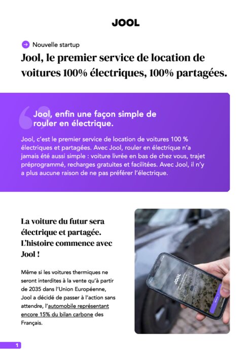 La voiture du futur sera électrique et partagée. L’histoire commence avec Jool ! Même si les voitures thermiques ne seront interdites à la vente qu’à partir de 2035 dans l’Union Européenne, Jool a décidé de passer à l’action sans attendre, l’automobile représentant encore 15% du bilan carbone des Français.