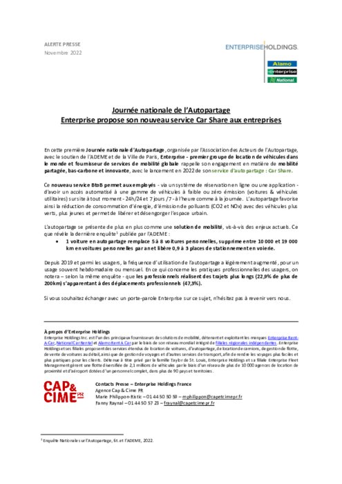 En cette première Journée nationale d’Autopartage, organisée par l'Association des Acteurs de l'Autopartage, avec le soutien de l'ADEME et de la Ville de Paris, Enterprise - premier groupe de location de véhicules dans le monde et fournisseur de services de mobilité globale rappelle son engagement en matière de mobilité partagée, bas-carbone et innovante, avec le lancement en 2022 de son service d’autopartage : Car Share.