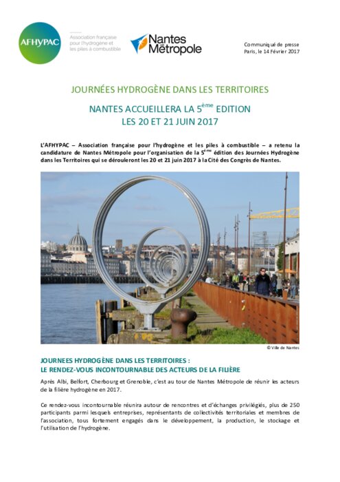 L'AFHYPAC - Association française pour l'hydrogène et les piles à combustible - a retenu la candidature de Nantes Métropole pour l'organisation de la 5ème édition des Journées Hydrogène dans les Territoires qui se dérouleront les 20 et 21 juin 2017 à la Cité des Congrès de Nantes.