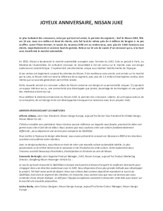 Le plus turbulent des crossovers, celui par qui tout est arrivé, le pionnier du segment… bref le Nissan JUKE, fête ses 10 ans. Avec son million et demi de clients, cela fait tout de même près de 6 millions de bougies à ne pas souffler. Lancé l'hiver dernier, le succès du nouveau JUKE est au rendez-vous, avec en France plus de 5 000 livraisons aux clients, majoritairement en versions haut de gamme. Retour sur 10 ans de succès d'un crossover qui a, à lui tout seul, transformé le marché automobile.