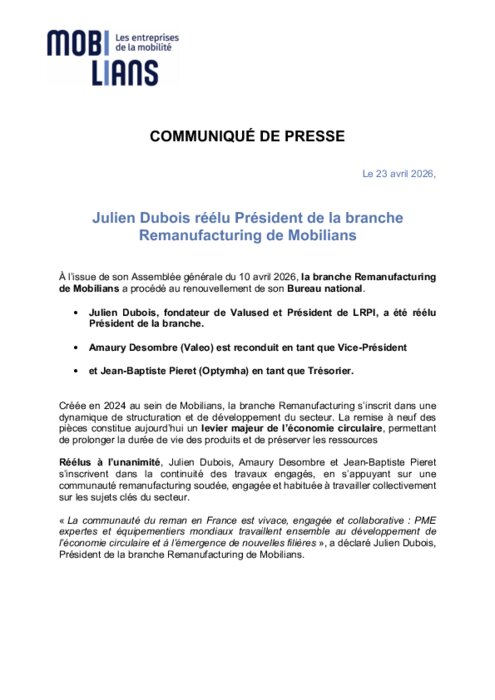 Créée en 2024 au sein de Mobilians, la branche Remanufacturing s’inscrit dans une dynamique de structuration et de développement du secteur. La remise à neuf des pièces constitue aujourd’hui un levier majeur de l’économie circulaire, permettant de prolonger la durée de vie des produits et de préserver les ressources. Réélus à l’unanimité, Julien Dubois, Amaury Desombre et Jean-Baptiste Pieret s’inscrivent dans la continuité des travaux engagés, en s’appuyant sur une communauté remanufacturing soudée, engagée et habituée à travailler collectivement sur les sujets clés du secteur.