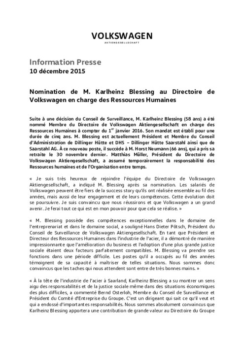 Suite à une décision du Conseil de Surveillance, M. Karlheinz Blessing (58 ans) a été nommé Membre du Directoire de Volkswagen en charge des Ressources Humaines à compter du 1er janvier 2016. Son mandat est établi pour une durée de cinq ans. M. Blessing est actuellement Président et Membre du Conseil d'Administration de Dillinger Hütte et DHS – Dillinger Hütte Saarstahl ainsi que de Saarstahl AG. À ce nouveau poste, il succède à M. Horst Neumann (66 ans).