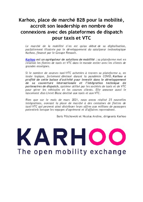Le marché de la mobilité n'en est qu'au début de sa digitalisation, parfaitement illustrée par le développement du catalyseur technologique Karhoo, financé par le Groupe Renault. Karhoo est un agrégateur de solutions de mobilité ; sa plateforme met en relation les flottes de taxis et VTC dans le monde entier avec les clients de grandes enseignes. Elle annonce aussi le lancement d'un Livret Blanc destiné aux taxis et aux VTC.