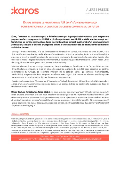 Karos, l’inventeur du court-voiturage, a été sélectionnée par le groupe Unibail-Rodamco pour intégrer son programme d’accompagnement "UR LINK", piloté en partenariat avec NUMA et dédié aux startups qui vont transformer les centres commerciaux. Karos va ainsi bénéficier pendant quatre mois d’un accompagnement personnalisé, ainsi que d’un accès privilégié aux centres d’Unibail-Rodamco afin de développer les solutions de mobilité de demain.