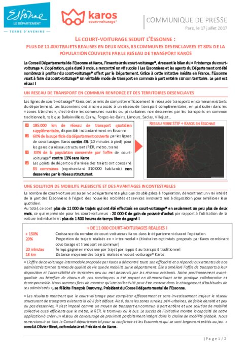Le Conseil Départemental de l'Essonne et Karos, l'inventeur du court-voiturage, dressent le bilan du " Printemps du court-voiturage ". L'opération, qui a duré 3 mois, a rencontré un vif succès ! Les Essonniens et les agents du Département ont été nombreux à profiter du court-voiturage offert par le Département. Grâce à cette initiative inédite en France, l'Essonne visait à faire du court-voiturage un véritable mode de transport en commun à part entière sur son territoire. Le pari est réussi !