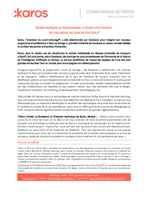 Karos, l'inventeur du court-voiturage, a été sélectionnée par Facebook pour intégrer son nouveau programme d'accélération " Start up Garage ", première initiative de Facebook au niveau mondial dédiée au soutien des jeunes entreprises innovantes. Karos, dont la mission est de transformer la voiture individuelle en réseaux structurés de transport collectif, fait ainsi partie, selon Facebook, des startups les plus prometteuses de l'économie de la Data et de l'Intelligence Artificielle en Europe.