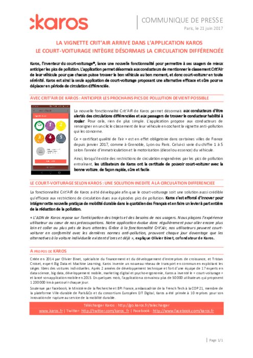 La nouvelle fonctionnalité Crit'AIR de Karos permet désormais aux conducteurs d'être alertés des circulations différenciées et aux passagers de trouver le conducteur habilité à rouler. Pour cela, rien de plus simple. L'application propose aux conducteurs de renseigner en un clic le classement de leur véhicule en cochant la vignette anti-pollution qui les concerne. Ce « certificat qualité de l'air » est en effet obligatoire dans certaines villes de France depuis janvier 2017...