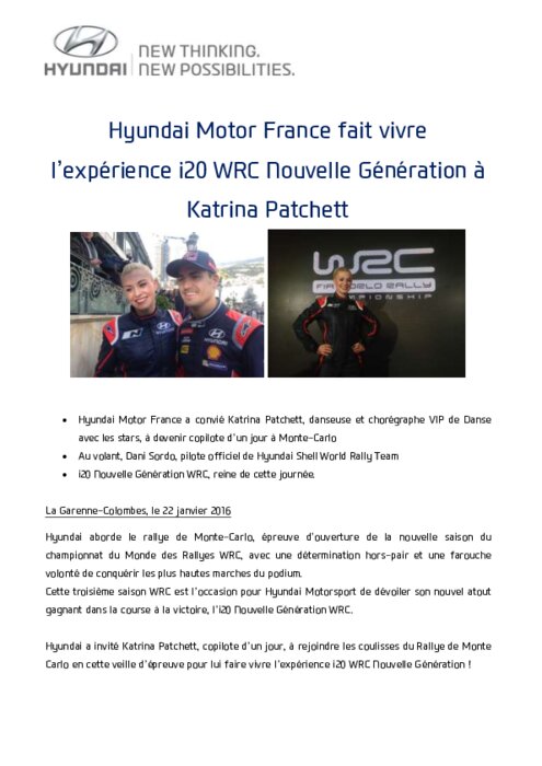 Hyundai aborde le rallye de Monte-Carlo, épreuve d’ouverture de la nouvelle saison du championnat du Monde des Rallyes WRC, avec une détermination hors-pair et une farouche volonté de conquérir les plus hautes marches du podium. Cette troisième saison WRC est l’occasion pour Hyundai Motorsport de dévoiler son nouvel atout gagnant dans la course à la victoire, l’i20 Nouvelle Génération WRC.