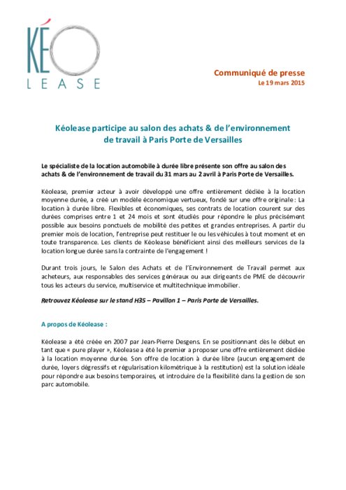 Services 19 mars 2015 - 15:06 Le spécialiste de la location automobile à durée libre présente son offre au salon des achats & de l'environnement de travail du 31 mars au 2 avril à Paris Porte de Versailles. PDF (65 Ko) Télécharger