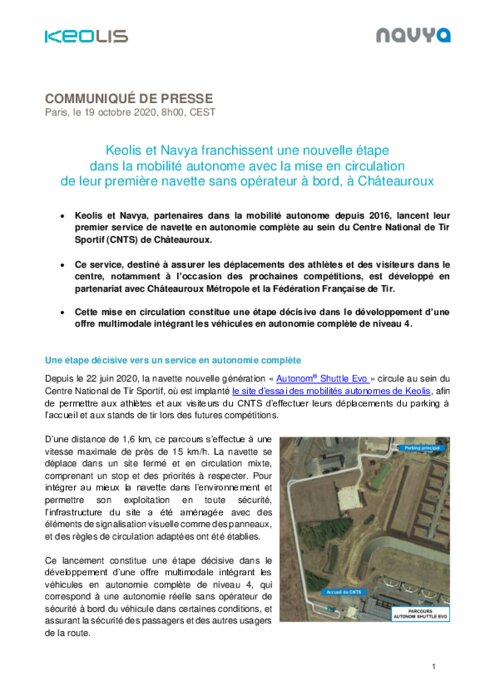 Keolis et Navya: mise en circulation de la première navette sans opérateur à bord, à Châteauroux