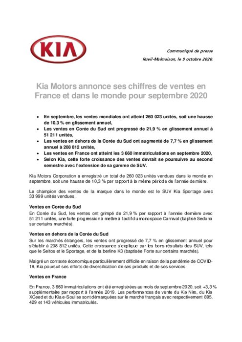 Kia Motors Corporation a enregistré un total de 260 023 unités vendues dans le monde en septembre, soit une hausse de 10,3 % par rapport à la même période de l’année dernière. Le champion des ventes de la marque dans le monde est le SUV Kia Sportage avec 33 999 unités vendues.
