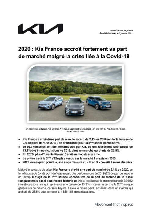 Malgré le contexte de crise, Kia France a atteint une part de marché de 2,4% en 2020, en forte hausse de 0,4 de point de % au regard des performances de 2019 (2% de part de marché en 2019). Il s’agit de la 5ème hausse consécutive de la part de marché de la filiale française mais aussi d’un record historique. Kia a totalisé sur le marché français 39 052 immatriculations, ce qui représente une baisse de 13,3%...