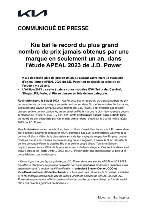Kia a décroché plus de prix en un an qu’aucune autre marque avant elle, d’après l’étude APEAL 2023 de J.D. Power, et ce depuis la création de l’étude il y a 28 ans. L’édition 2023 de cette étude a vu les modèles EV6, Telluride, Carnival, Stinger, K5, Forte, et Rio se classer en tête de leur catégorie.