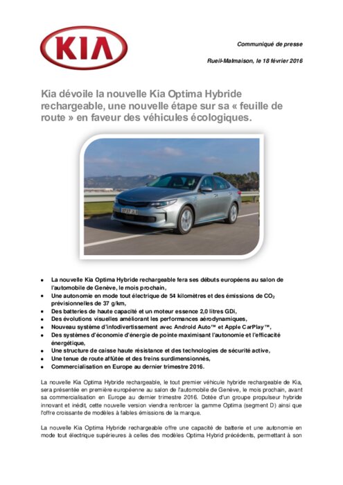La nouvelle Kia Optima Hybride rechargeable, le tout premier véhicule hybride rechargeable de Kia, sera présentée en première européenne au salon de l'automobile de Genève, le mois prochain, avant sa commercialisation en Europe au dernier trimestre 2016. Dotée d'un groupe propulseur hybride innovant et inédit, cette nouvelle version viendra renforcer la gamme Optima (segment D) ainsi que l'offre croissante de modèles à faibles émissions de la marque.