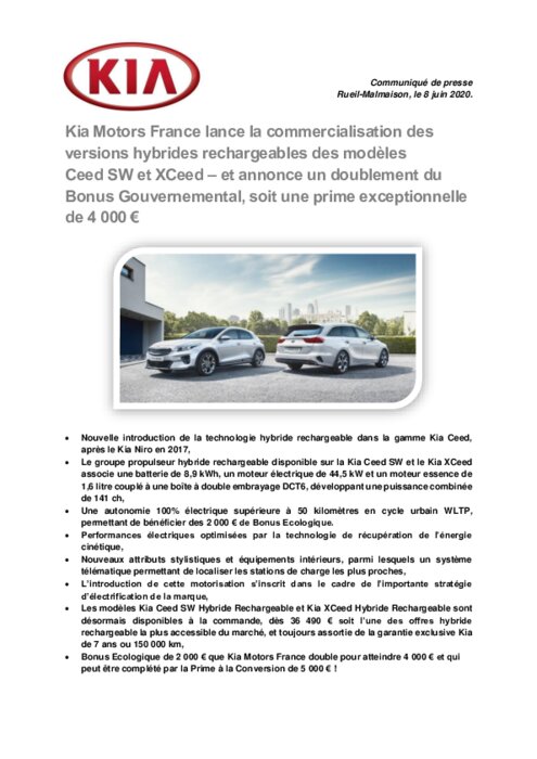 Kia double la prime gouvernementale pour les Ceed SW et XCeed hybrides rechargeables