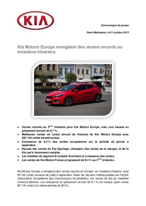 Kia Europe a enregistré des ventes records en Europe au troisième trimestre, avec 95 102 unités vendues de juillet à septembre. Selon les derniers chiffres publiés par l'ACEA (Association Européenne des Constructeurs Automobiles), les ventes de Kia au troisième trimestre affichent une croissance en glissement annuel de 9,7 % (la marque ayant vendu 86 718 unités à la même période de 2014).