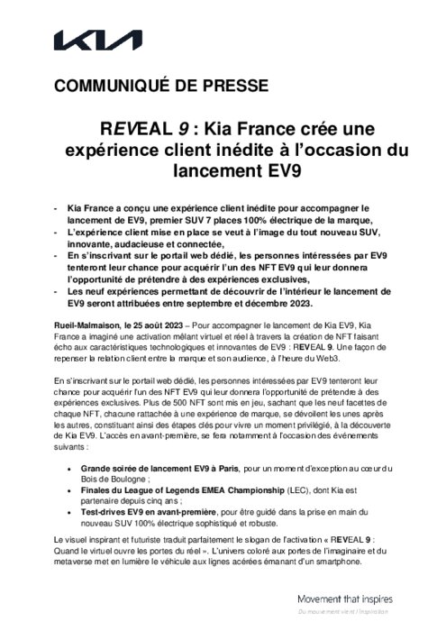 Pour accompagner le lancement de Kia EV9, Kia France a imaginé une activation mêlant virtuel et réel à travers la création de NFT faisant écho aux caractéristiques technologiques et innovantes de EV9 : REVEAL 9. Une façon de repenser la relation client entre la marque et son audience, à l’heure du Web3.