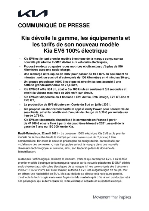 Le crossover 100% électrique Kia EV6 est le premier modèle de la nouvelle ère de la marque (cf. notre communiqué du 15 janvier) à être commercialisé. Il incarne la nouvelle philosophie de design de Kia, caractérisée par « L’alliance des contraires », mais il propulse surtout la marque dans une nouvelle dimension technologique, et conforte, ainsi, son leadership dans le domaine de l’électrification.