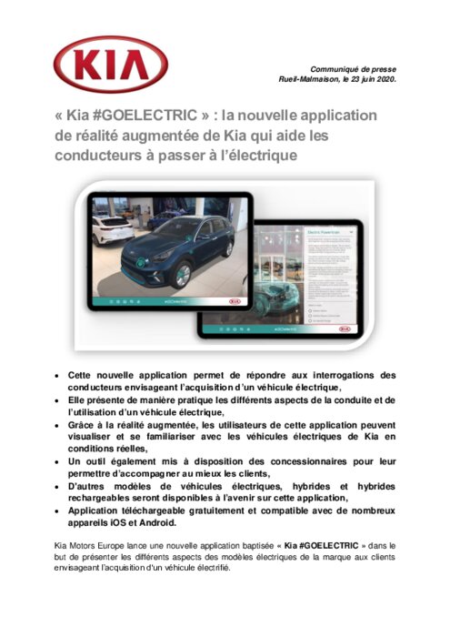 Constructeurs 23 juin 2020 - 14:40 Kia Motors Europe lance une nouvelle application baptisée " Kia #GOELECTRIC " dans le but de présenter les différents aspects des modèles électriques de la marque aux clients envisageant l’acquisition d'un véhicule électrifié. PDF (505 Ko) Télécharger
