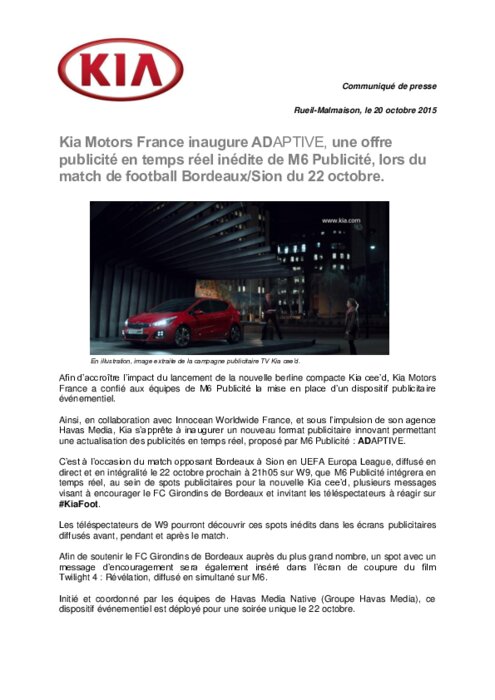 Afin d’accroître l’impact du lancement de la nouvelle berline compacte Kia cee’d, Kia Motors France a confié aux équipes de M6 Publicité la mise en place d’un dispositif publicitaire événementiel. Ainsi, en collaboration avec Innocean Worldwide France, et sous l’impulsion de son agence Havas Media, Kia s’apprête à inaugurer un nouveau format publicitaire innovant permettant une actualisation des publicités en temps réel, proposé par M6 Publicité : ADAPTIVE.