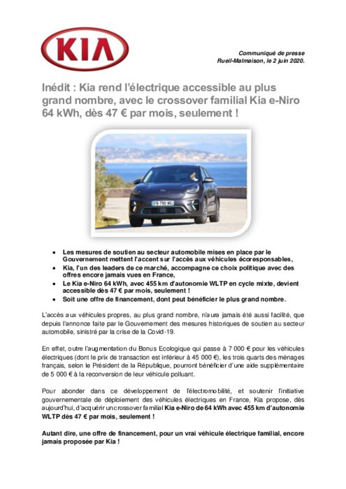 Kia: Kia e-Niro 64 kWh, dès 47 € par mois, seulement
